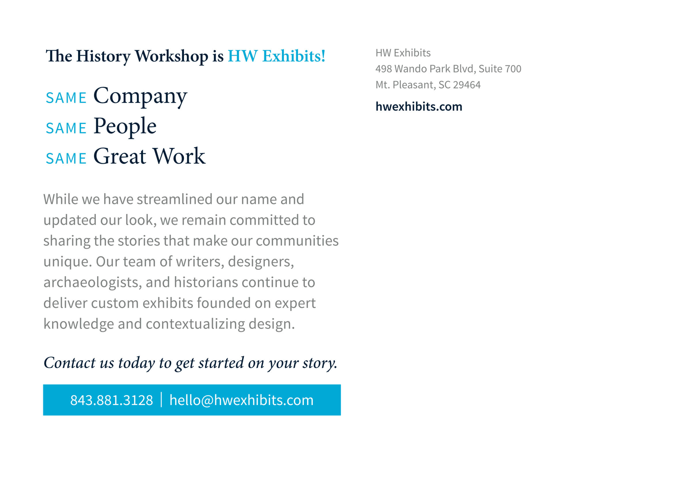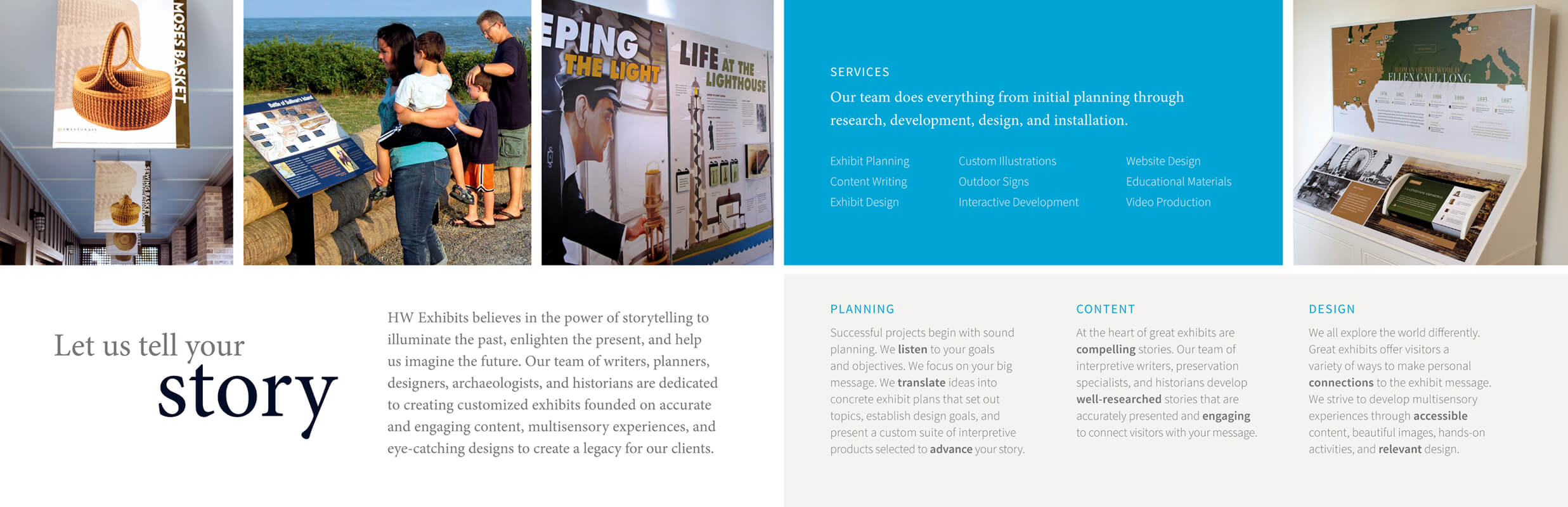 I led the rebranding of The History Workshop, renaming it HW Exhibits and redefining its brand positioning, voice, and taglines based on competitive research and stakeholder insights. I developed brand guidelines, along with marketing collateral and a new website, ensuring consistent brand representation that strengthened market presence and inspired similar branding shifts among competitors.